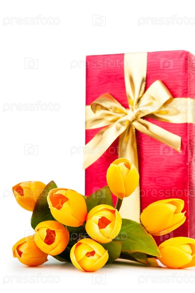 Красивая подарочная коробка и букет тюльпанов