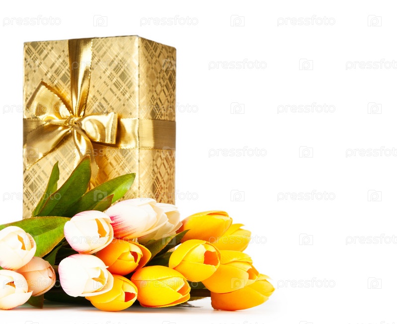 Красивая подарочная коробка и букет тюльпанов