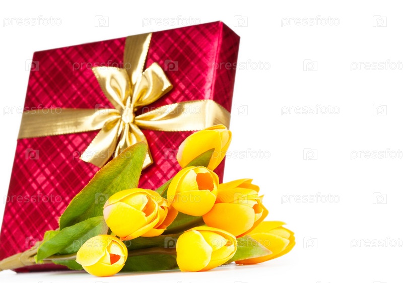 Красивая подарочная коробка и букет тюльпанов
