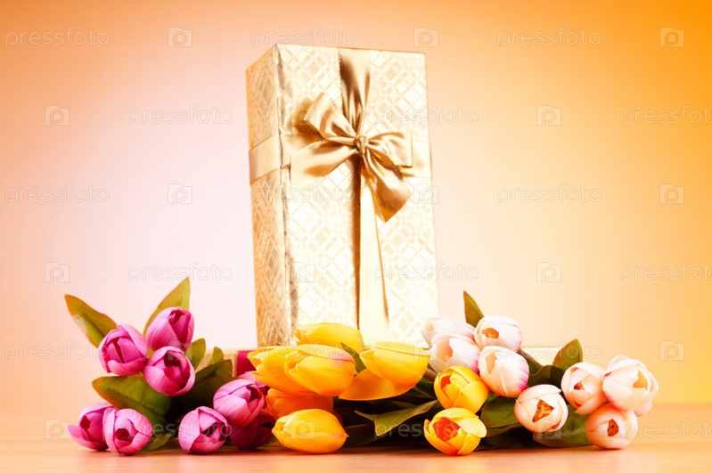 Красивая подарочная коробка и букет тюльпанов