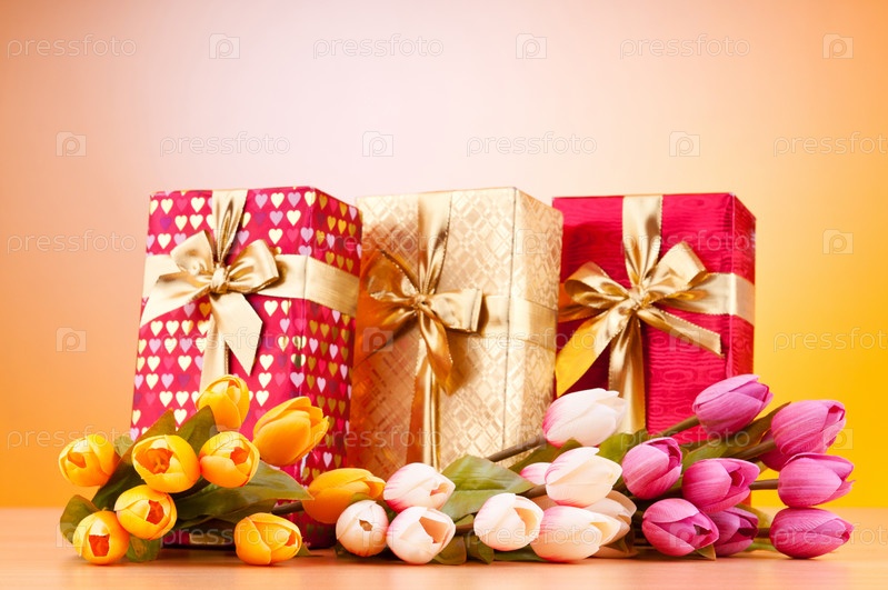 Красивые подарочные коробки и букет тюльпанов