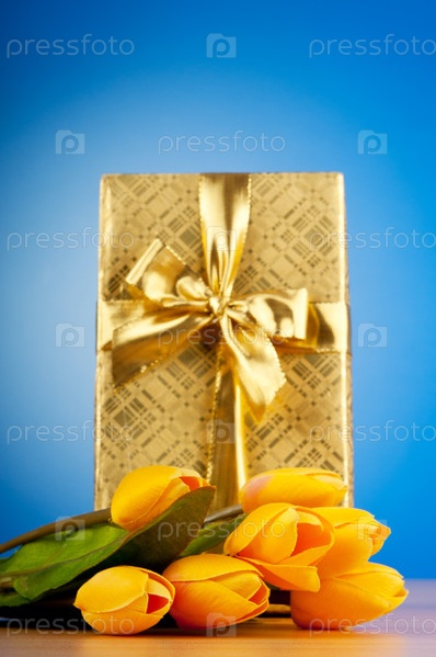 Красивая подарочная коробка и букет тюльпанов