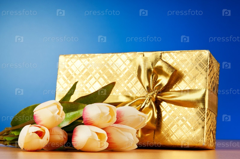 Красивая подарочная коробка и букет тюльпанов