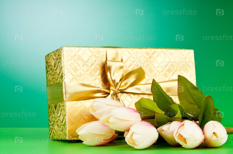 Красивая подарочная коробка и букет тюльпанов