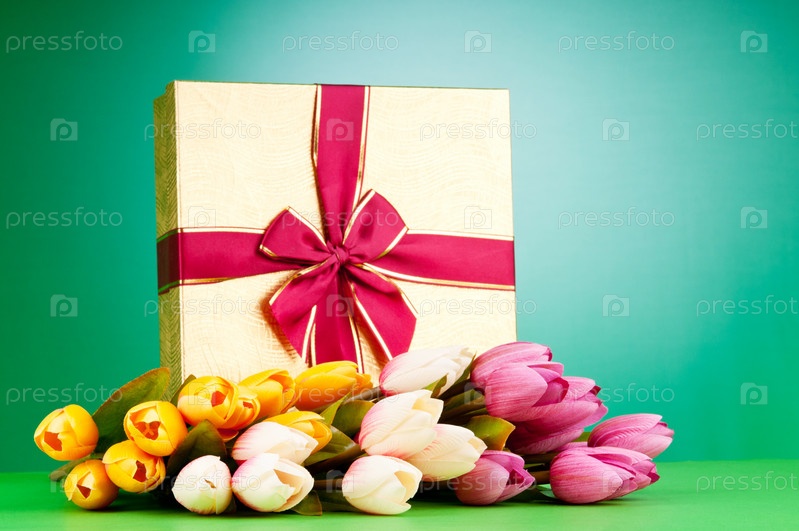 Красивая подарочная коробка и букет тюльпанов