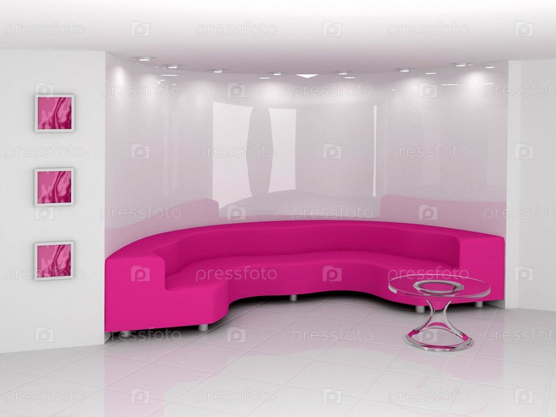 Розовый диван в белом минималистическом интерьере