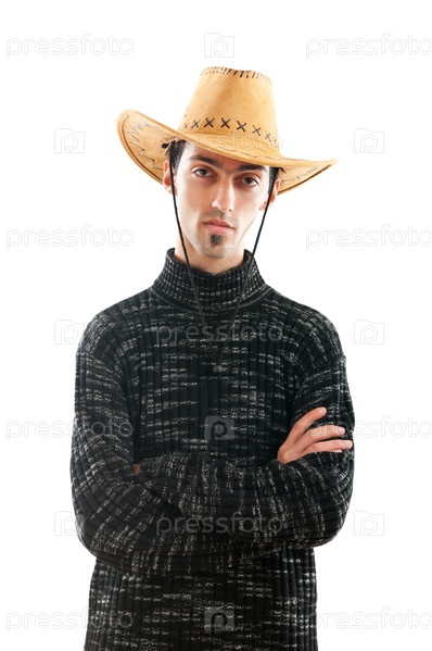 Молодой человек в ковбойской шляпе на белом фоне