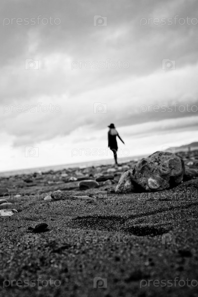 Силуэт молодой женщины на песчаном пляже на берегу моря