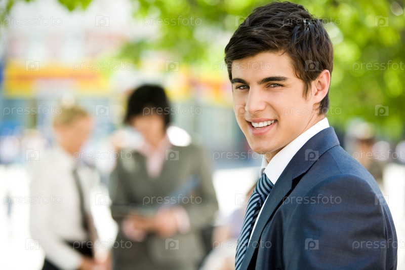 Портрет уверенного бизнесмена, улыбающегося на камеру в естественной среде