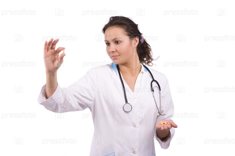 Медсестра держит маленькую оранжевую таблетку в своих пальцах.Фармацевт держат таблетки.Женщина-специалист по здравоохранению с рецептом