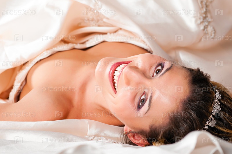 Счастливая невеста лежит на полу в свадебном платье и смотрит в камеру