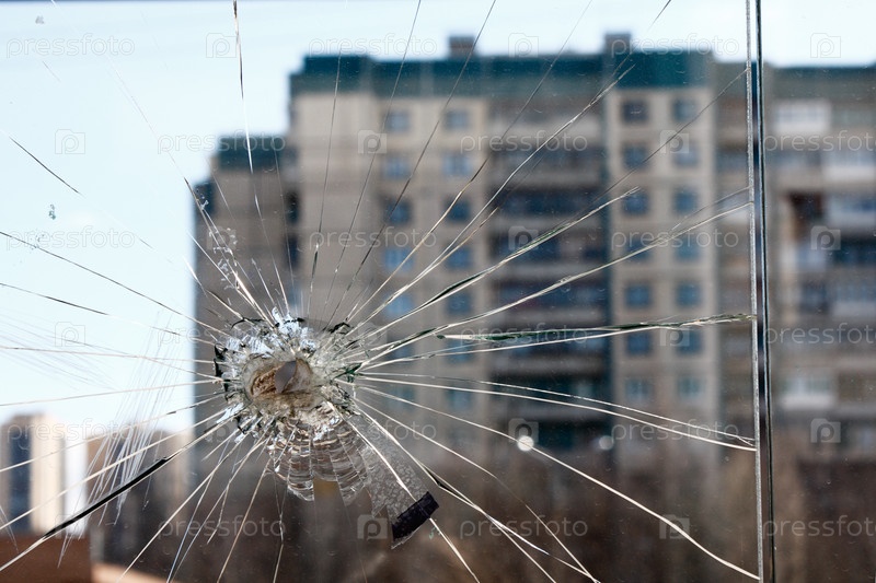 Вид на многоэтажный дом через треснувшее стекло