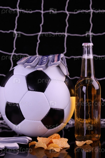 Футбольный мяч, перчатки, бутылка пива и чипсы