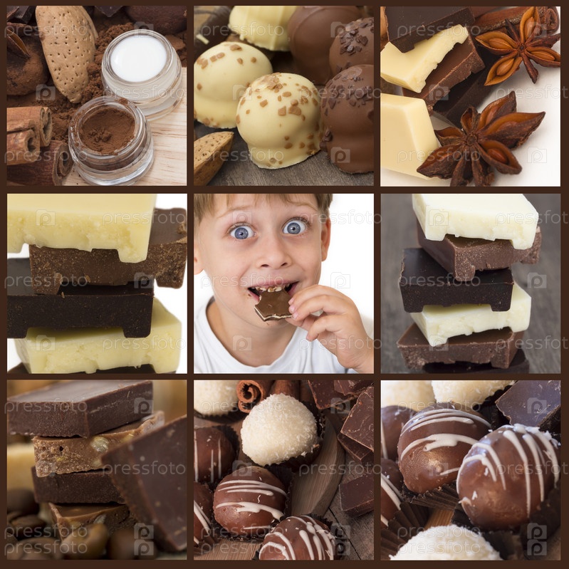 Счастливый мальчик ест шоколад, коллаж