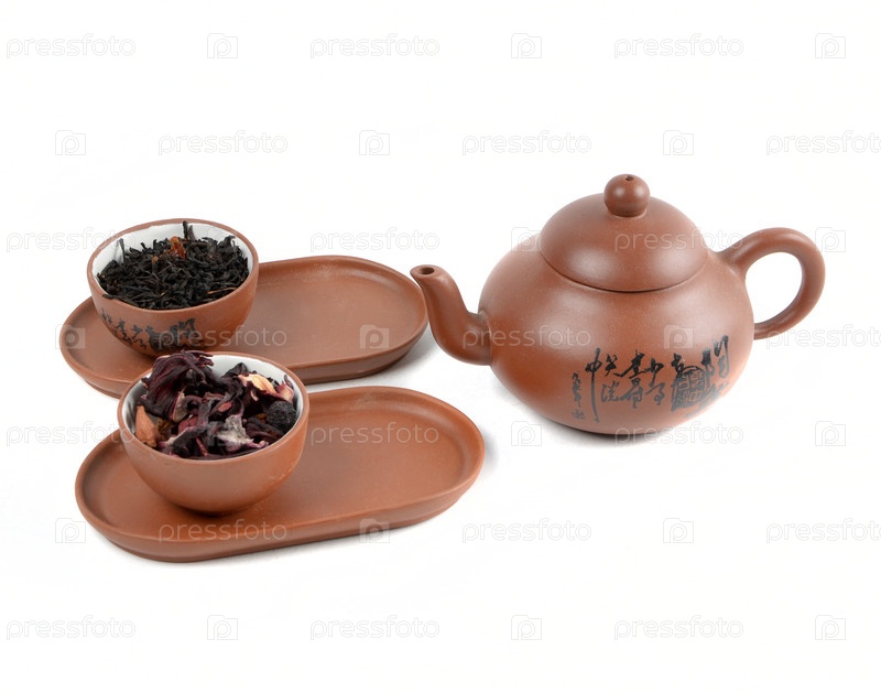 Глиняный чайник и чашки с чаем