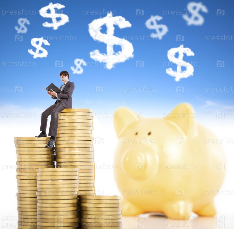 Бизнесмен с монетами и копилкой