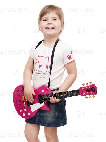 Маленькая девочка с игрушечной гитарой на белом фоне