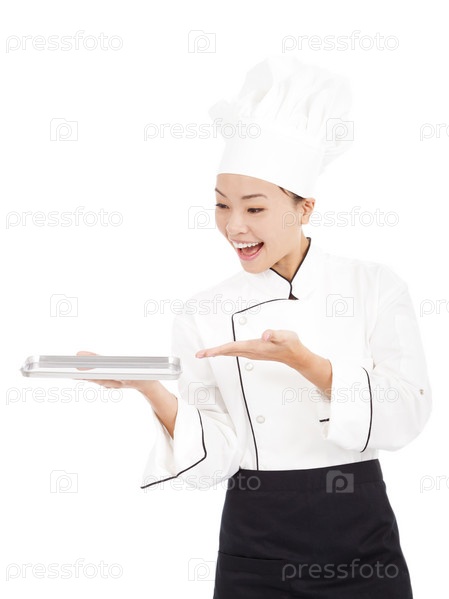 Молодая женщина шеф-повар с подносом