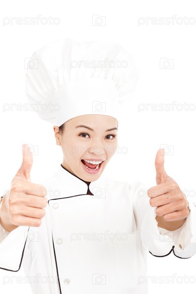 Симпатичная женщина шеф-повар показывает ОК