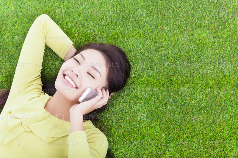 Молодая женщина с телефоном на зеленом лугу