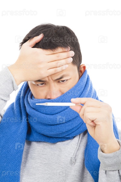 Больной молодой измеряет температуру