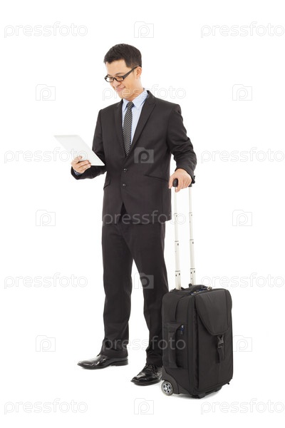 Молодой бизнесмен держит планшет и чемодан