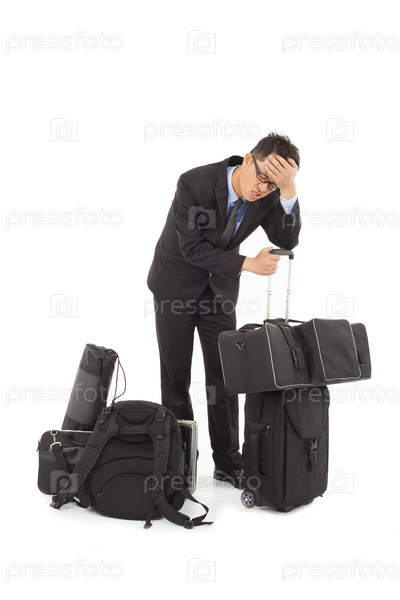 Уставший молодой бизнесмен с кучей вещей