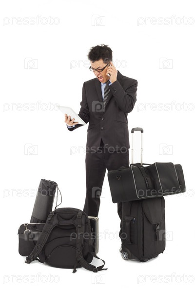 Уставший молодой бизнесмен с кучей вещей