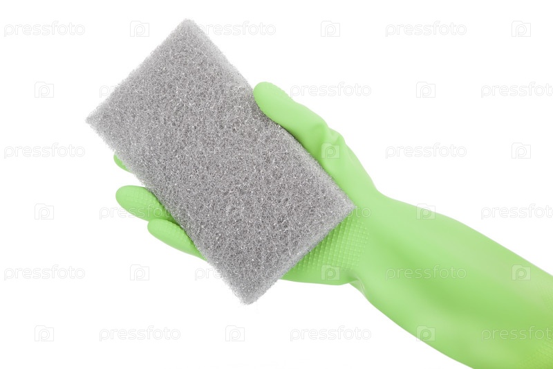 Рука в резиновой перчатке с губкой