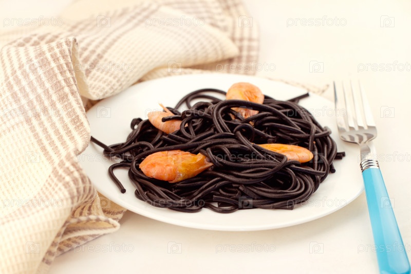 Черные спагетти с креветками