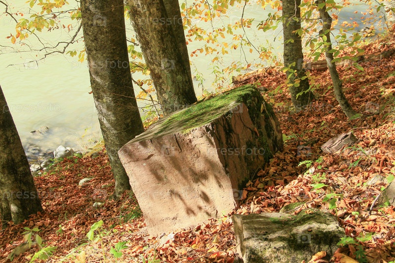 Камень в форме куба на берегу реки
