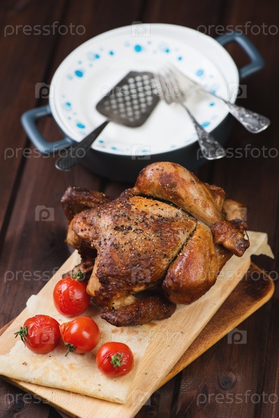 Целая запеченная курица с помидорами