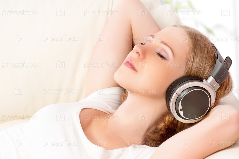 Девушка в наушниках на диване