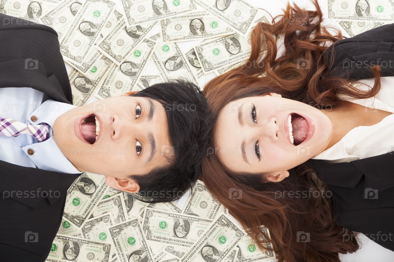 Счастливый бизнесмен и бизнес-леди лежат на деньгах