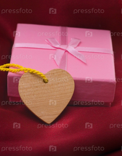 Деревянное сердце и подарок на атласной драпировке - Сувенир в день святого Валентина (Valentine's Day)