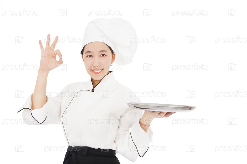 Молодая женщина шеф-повар с пустым подносом