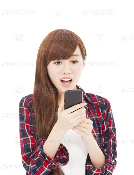 Удивленная молодая женщина со смартфоном