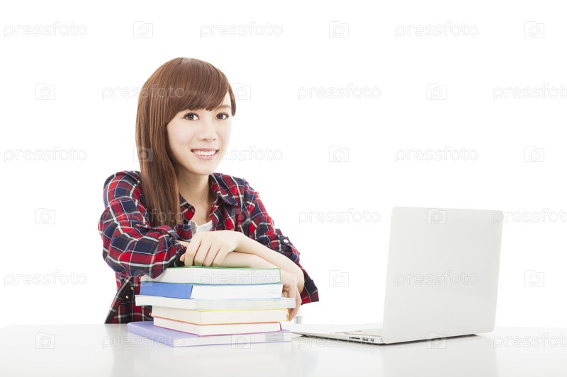 Счастливая студентка на белом фоне