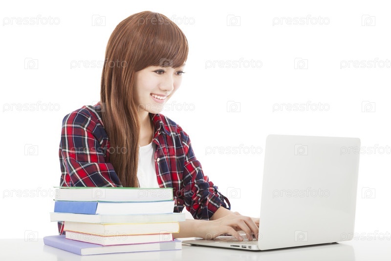 Счастливая студентка на белом фоне