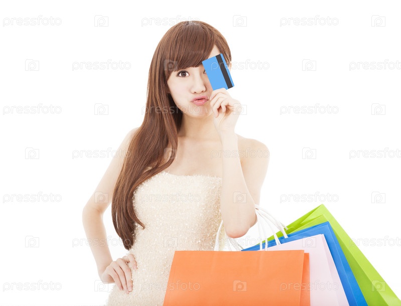 Молодая женщина с кредитной картой и покупками
