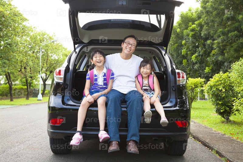Счастливая семья сидит в автомобиле