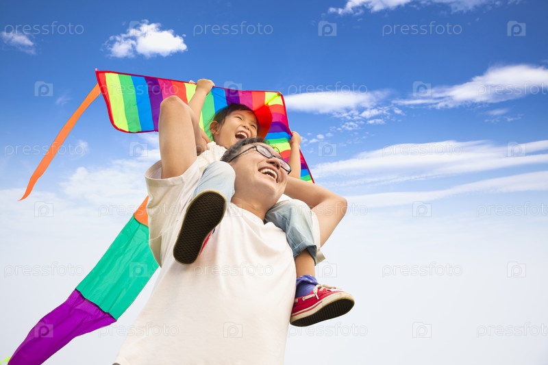 Счастливый отец и маленькая девочка с кайтом