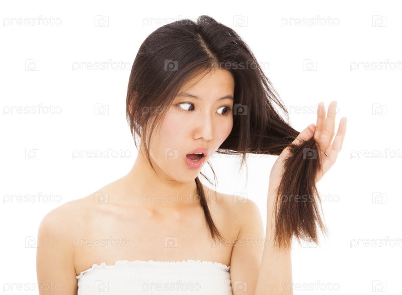 Женщина удивленно смотрит на волосы