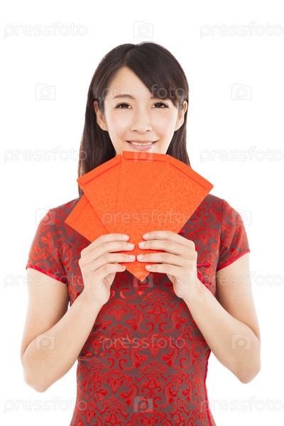 Улыбающаяся китаянка с новогодними конвертами