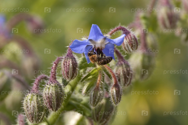 Пчела пьет нектар на скважине лекарственный, иораго officinalis