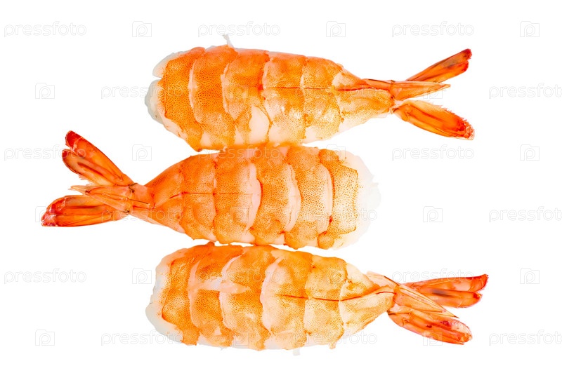 Три суши с креветками и рисом на белом фоне