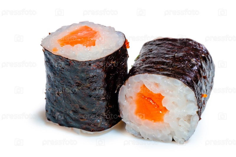Два ролла с лососем на белом фоне