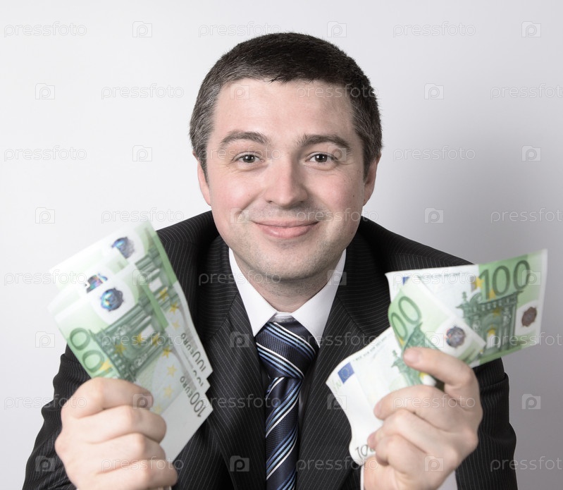 Портрет бизнесмена с евро купюрами на белом фоне