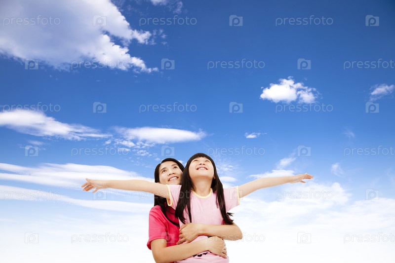 Маленькая девочка и мать смотрят в небо