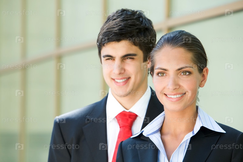 Портрет улыбающейся деловой женщины со своим партнером на заднем плане